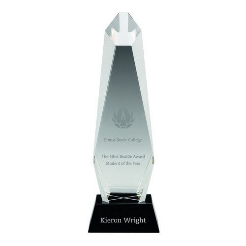 CLEAR GLASS HEXAGONAL COLUMN ON BLACK BASE - 13.5in